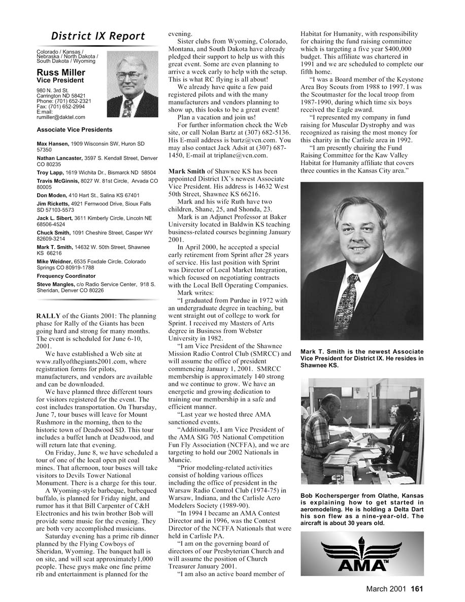 Mark Smith of Shawnee, KS has been appointed District IX's newest Associate Vice President. Mark and his wife Ruth have two children, Shane (25) and Shonda (23). Mark is an Adjunct Professor at Baker University and retired early from Sprint after 28 years, where he focused on local market integration. He is active in several community and modeling activities, including vice president of the Shawnee Mission Radio Control Club (SMRCC), involvement with SIG 705 NCFFA, and volunteer work with Habitat for Humanity and the Boy Scouts.