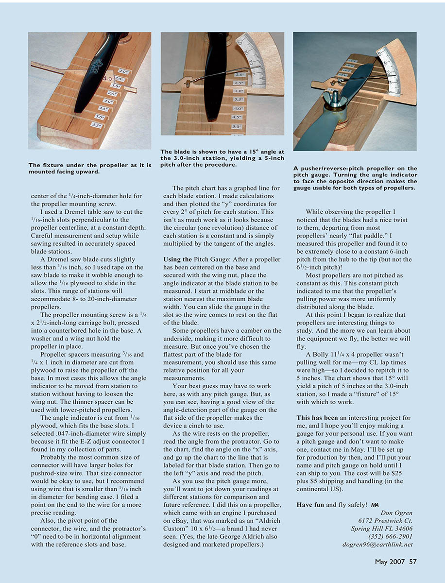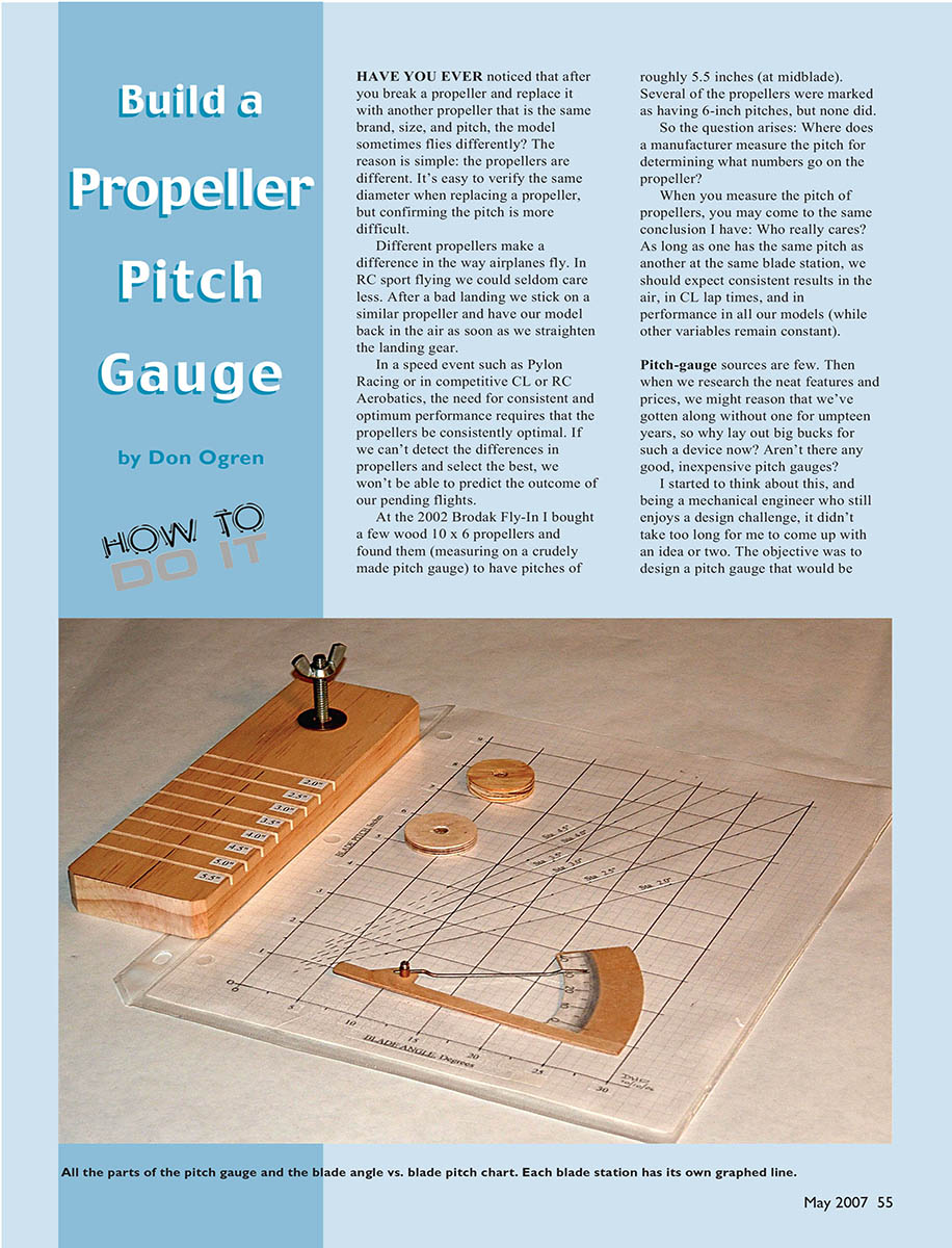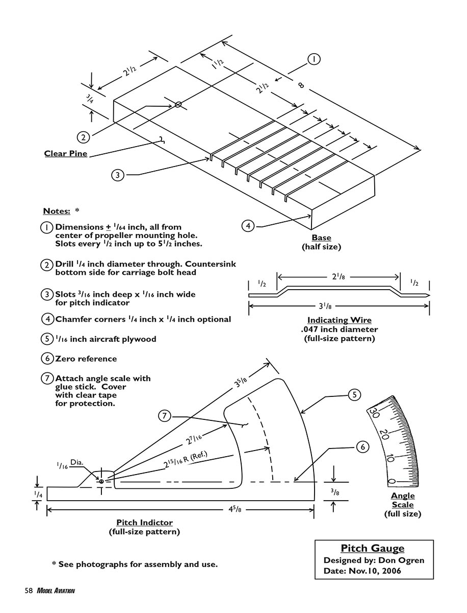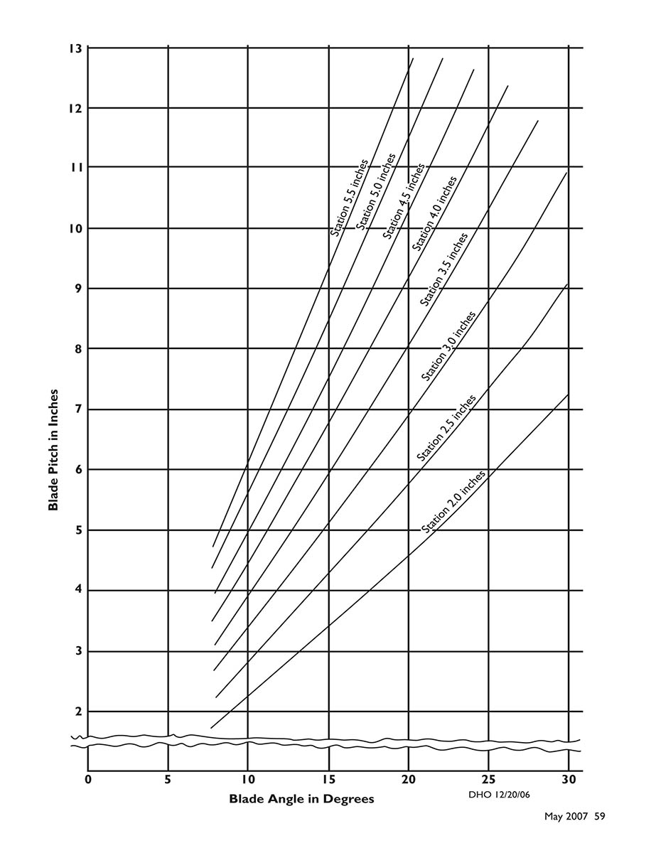 All the parts of the pitch gauge and the blade angle vs. blade pitch chart. Each blade station has its own graphed line.