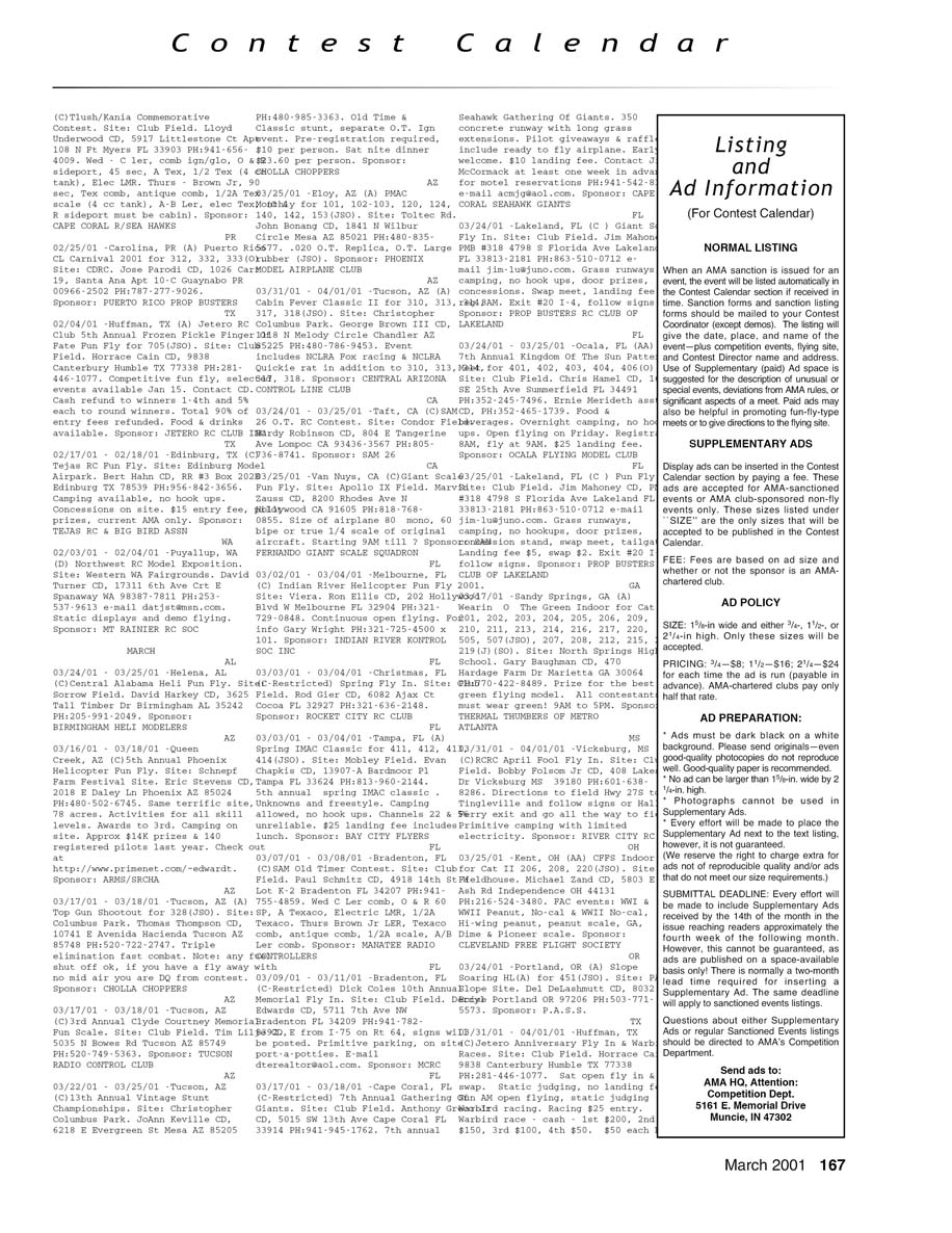 When an AMA sanction is issued for an event, the event will be listed automatically in the Contest Calendar section if received in time. Sanction forms and sanction listing forms should be mailed to your Contest Coordinator (except demos). The listing will give the date, place and name of the sanctioning club, competition points, flying site, and contest director name and address. Use of Supplementary (paid) ads is suggested for the description of unusual special events, deviations from AMA rules, or significant aspects of a meet. Paid ads may also help in promoting fun-fly-type meets or to give directions to the flying site.