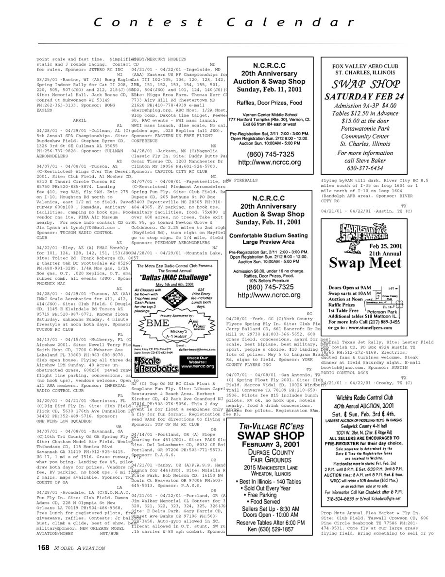 Note: Several entries on this page are partial or boxed by advertisements; boxed ad material has been excluded. For complete contact details and exact sites, consult the Contest Calendar listings in Model Aviation magazine or contact AMA Headquarters.