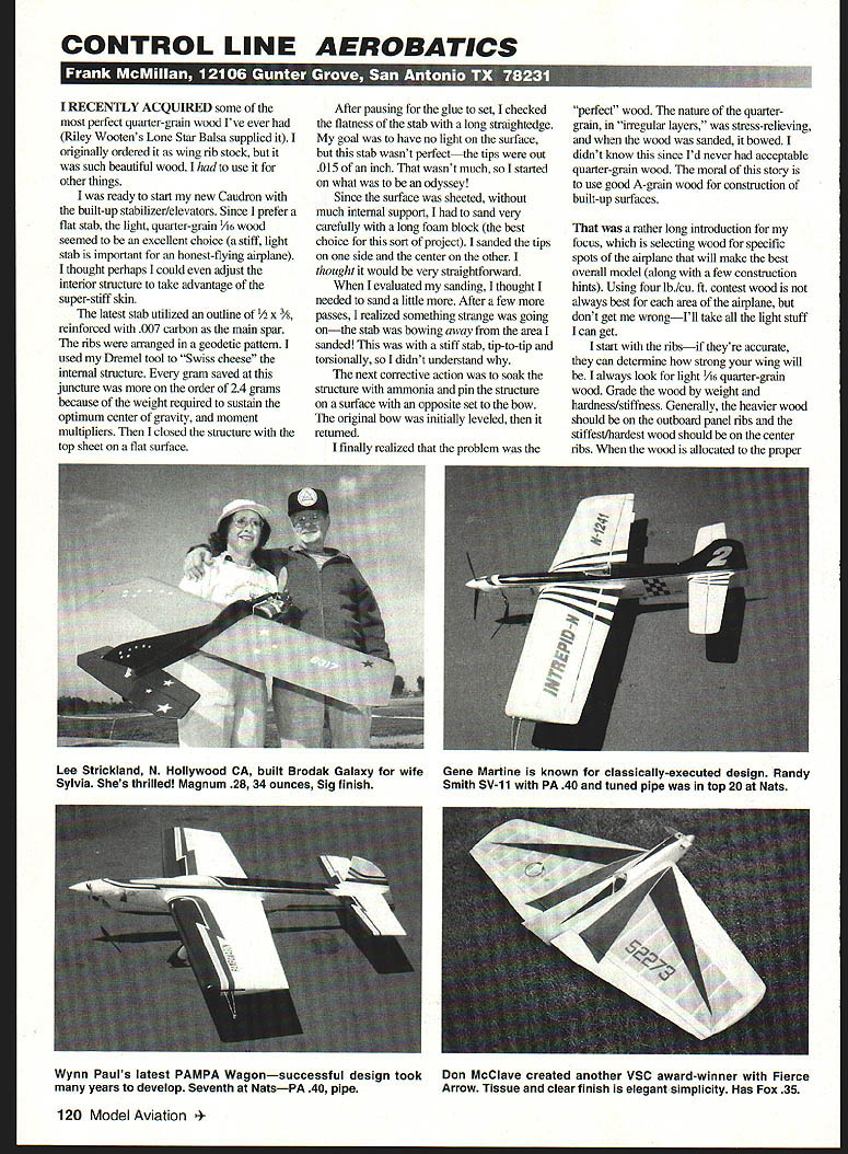 That was a rather long introduction for my focus, which is selecting wood for specific spots of the airplane that will make the best overall model (along with a few construction hints). Using four lb./cu. ft. contest wood is not always best for each area of the airplane, but — don't get me wrong — I'll take all the light stuff I can get.