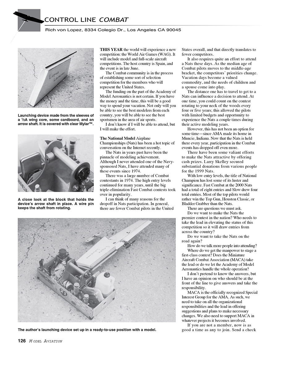 A better format would be 75 or 80 mph Combat with a variety of skill classes. This way, a novice could stand a chance of winning a trophy once in a while. The pilots in the New England states have a good thing going in a series of set contests throughout the year that feature skill categories. Their version of 75 mph Combat is called Formula GX. The results of many of these contests are featured in the MACA newsletter, so the participants can get a little recognition. This may be the class that revives participation in the Nats.