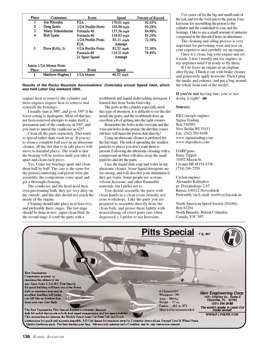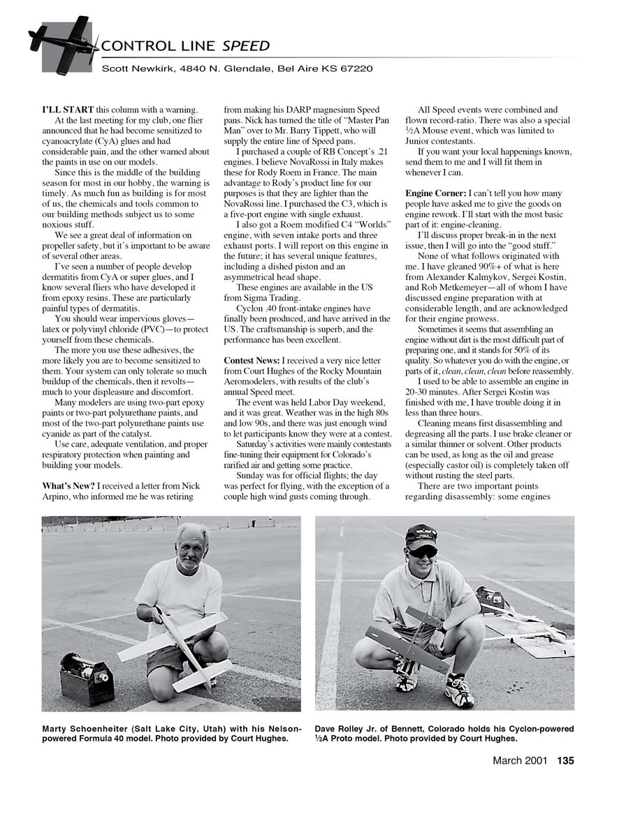 I received a very nice letter from Court Hughes of the Rocky Mountain Aeromodelers, with results of the club's annual Speed meet. The event was held Labor Day weekend, and it was great. Weather was in the high 80s and low 90s, and there was just enough wind to let participants know they were at a contest. Saturday's activities were mainly contestants fine-tuning their equipment for Colorado's rarified air and getting some practice. Sunday was for official flights; the day was perfect for flying, with the exception of a couple high wind gusts coming through. All Speed events were combined and flown record-ratio. There was also a special 1/2A Mouse event, which was limited to Junior contestants. If you want your local happenings known, send them to me and I will fit them in whenever I can.
