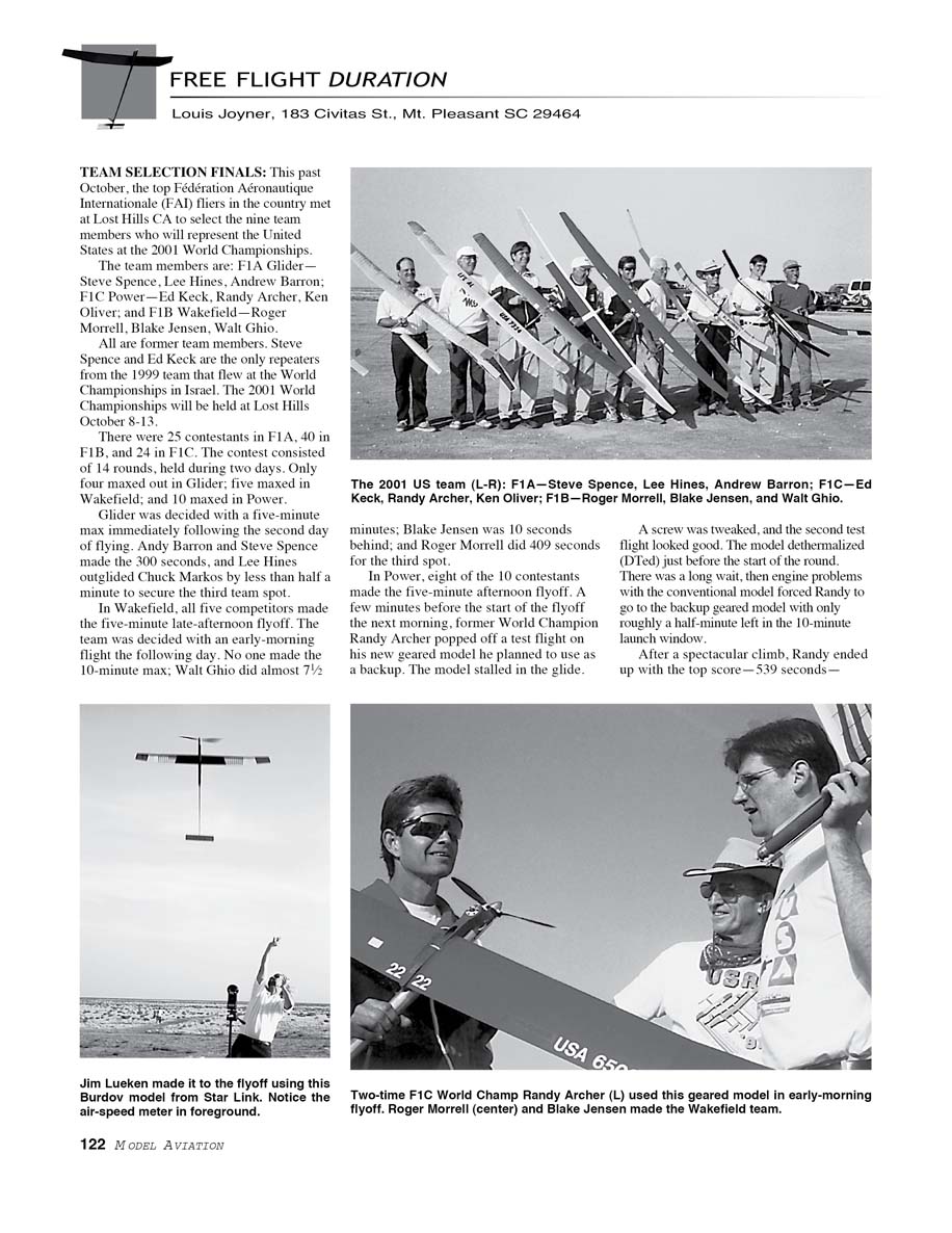 All are former team members. Steve Spence and Ed Keck are the only repeaters from the 1999 team that flew at the World Championships in Israel. The 2001 World Championships will be held at Lost Hills October 8–13.