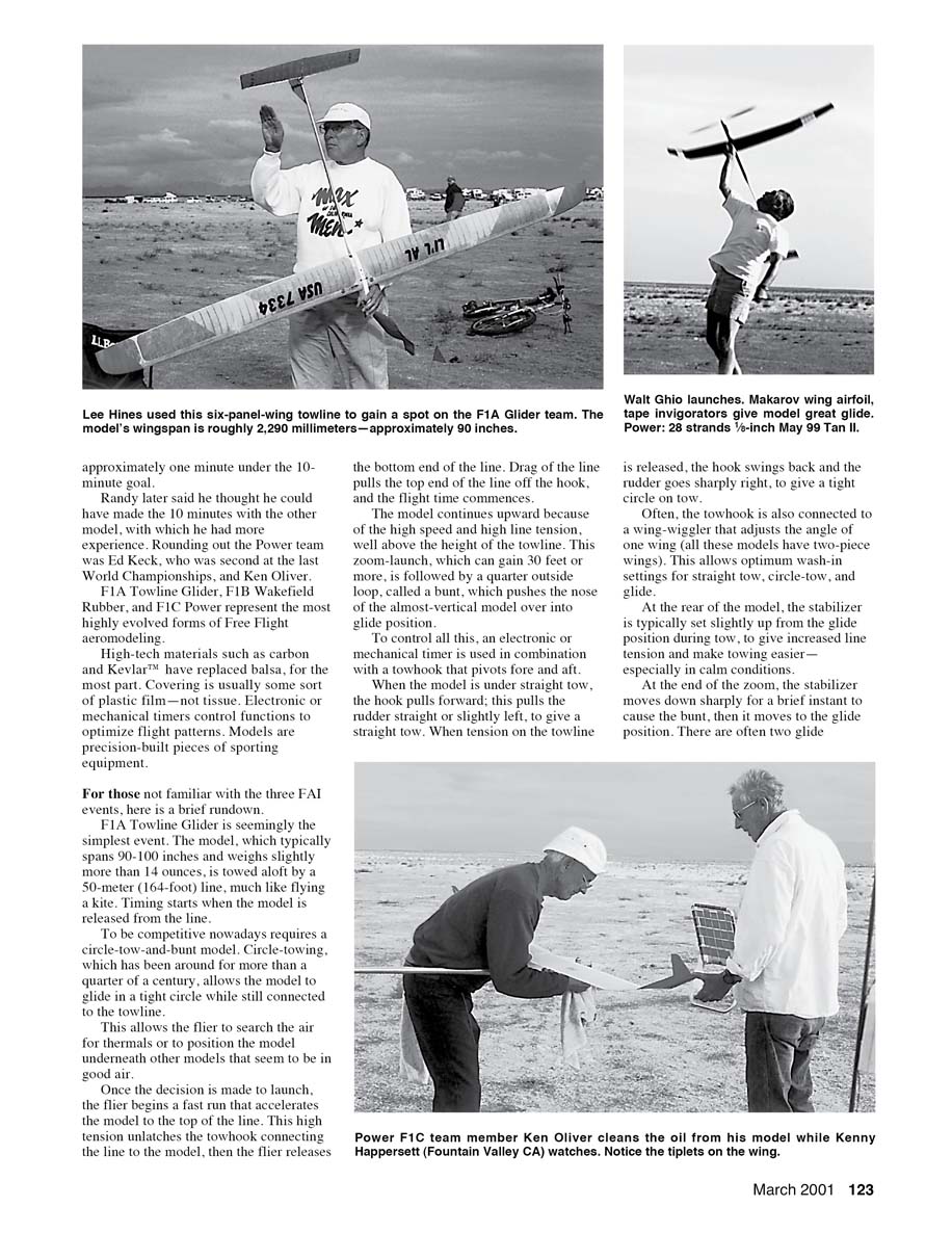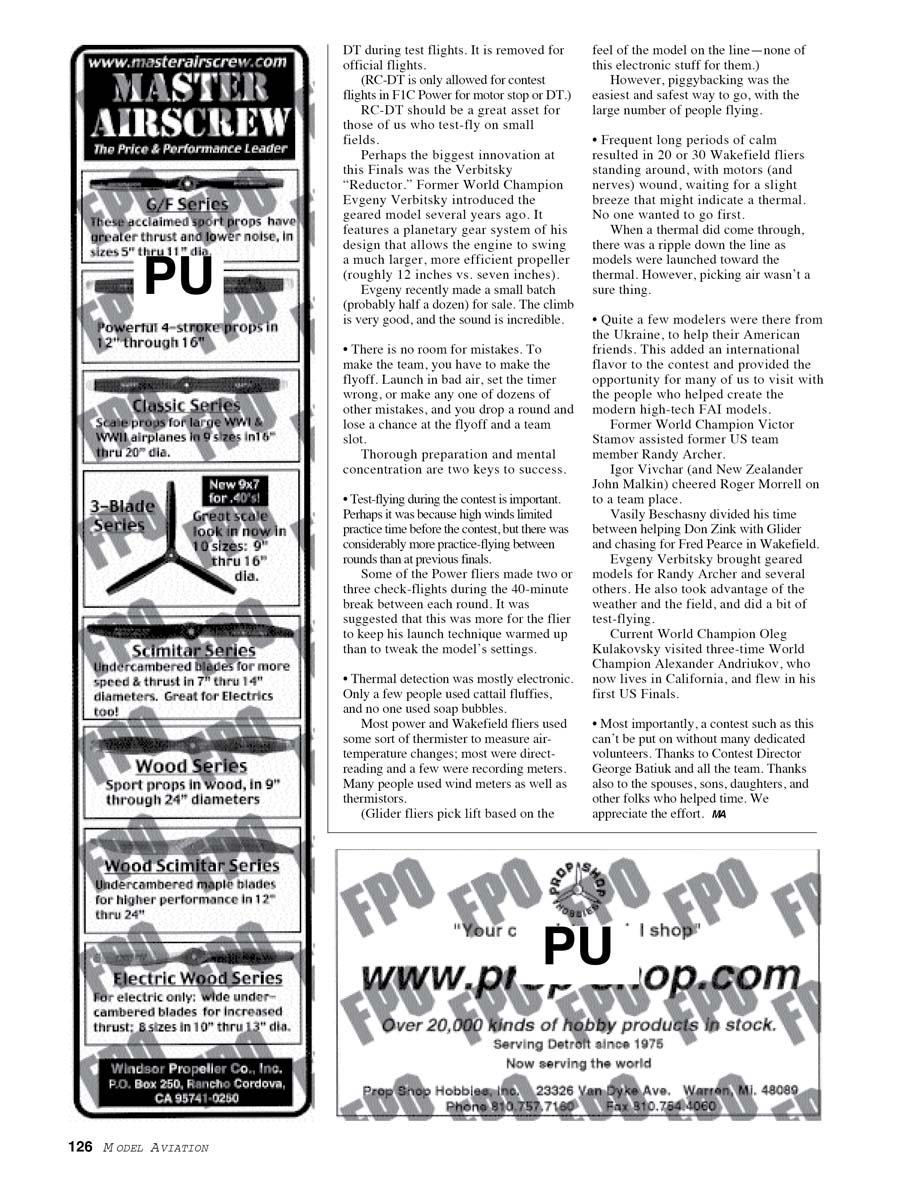 - Test-flying during the contest is important. Perhaps it was because high winds limited practice time before the contest, but there was considerably more practice-flying between rounds than at previous finals. Some of the Power fliers made two or three check-flights during the 40-minute break between each round. It was suggested that this was more for the flier to keep his launch technique warmed up than to tweak the model's settings.
