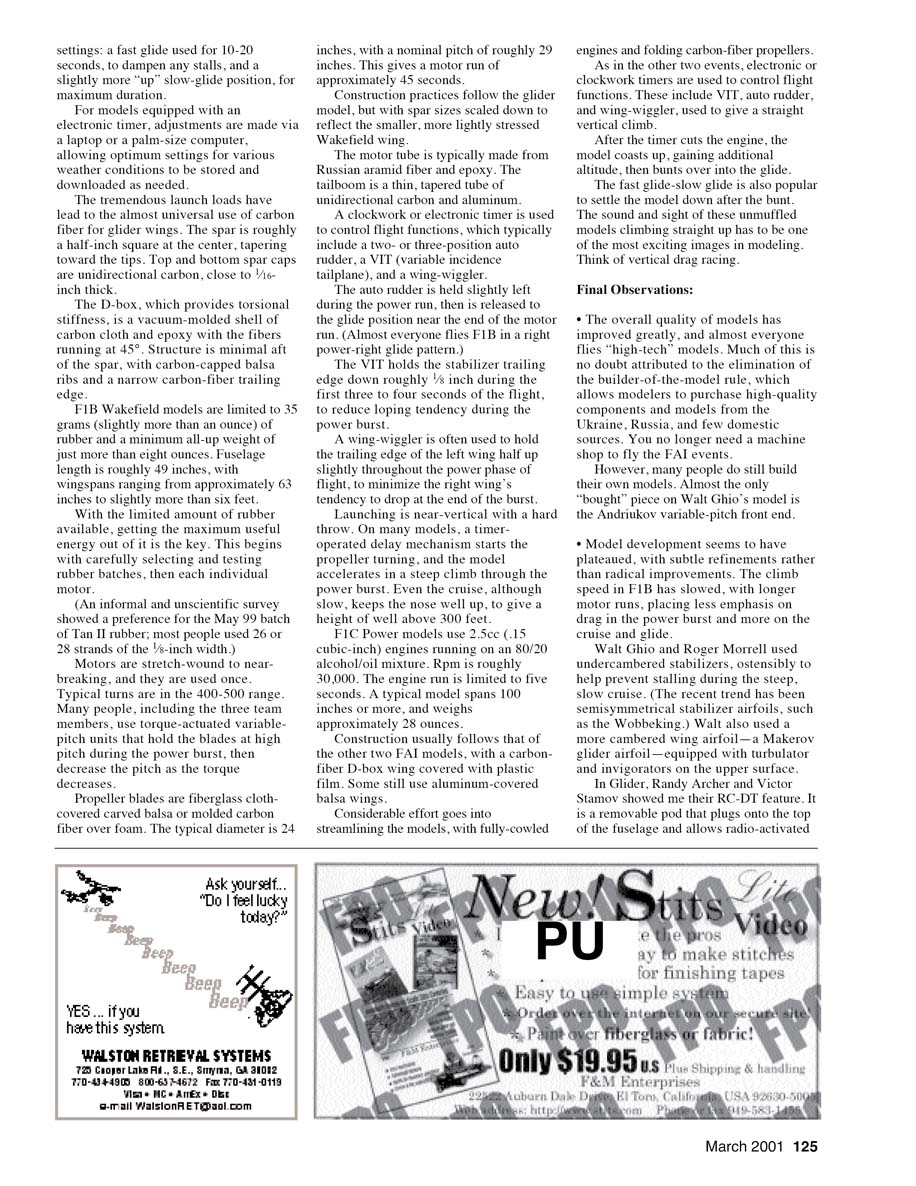 - Model development seems to have plateaued, with subtle refinements rather than radical improvements. The climb speed in F1B has slowed, with lower motor runs, placing less emphasis on drag in the power burst and more on cruise and glide. Walt Ghio and Roger Morrell used undercambered stabilizers, ostensibly to help prevent stalling during the steep, slow cruise. (The recent trend has been semisymmetric stabilizer airfoils, such as the Wobbleking.) Walt also used a more cambered wing airfoil—a Makevor glider airfoil—equipped with turbulator and invigorators on the upper surface.