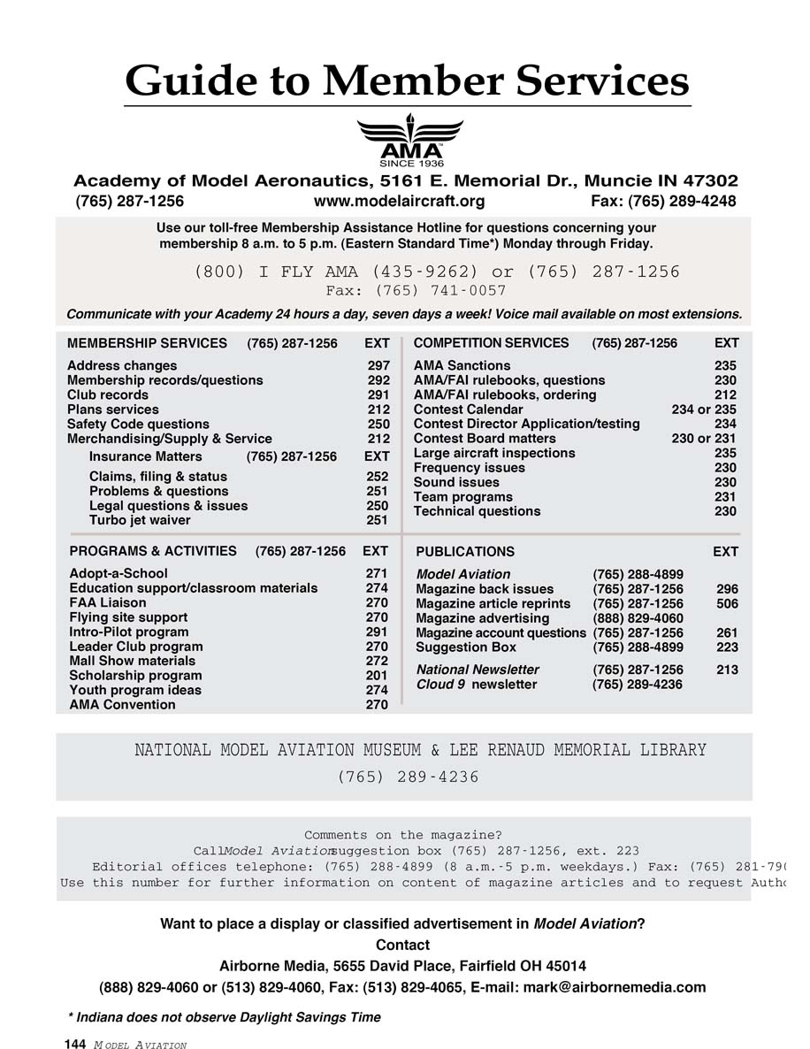 Academy of Model Aeronautics 5161 E. Memorial Dr., Muncie, IN 47302 Phone: (765) 287-1256 Website: www.modelaircraft.org Main fax: (765) 289-4248