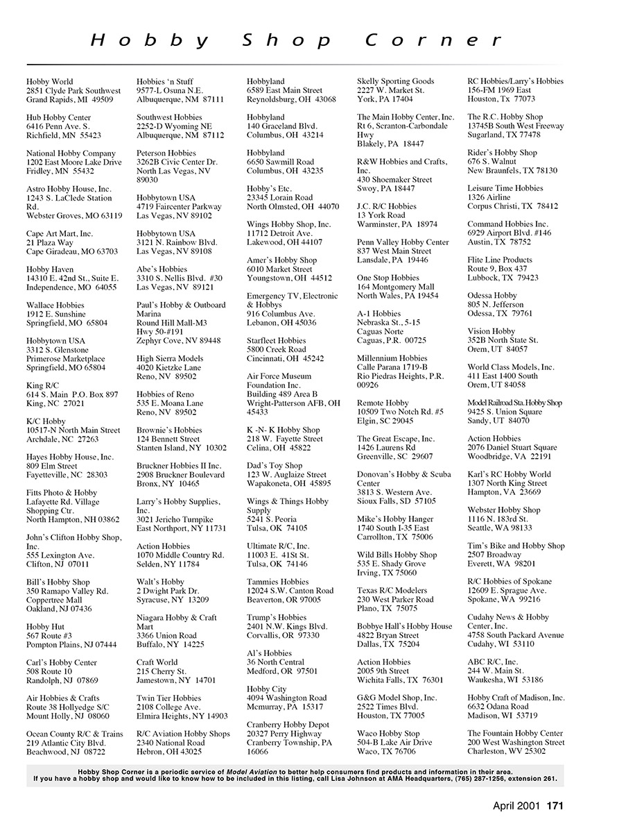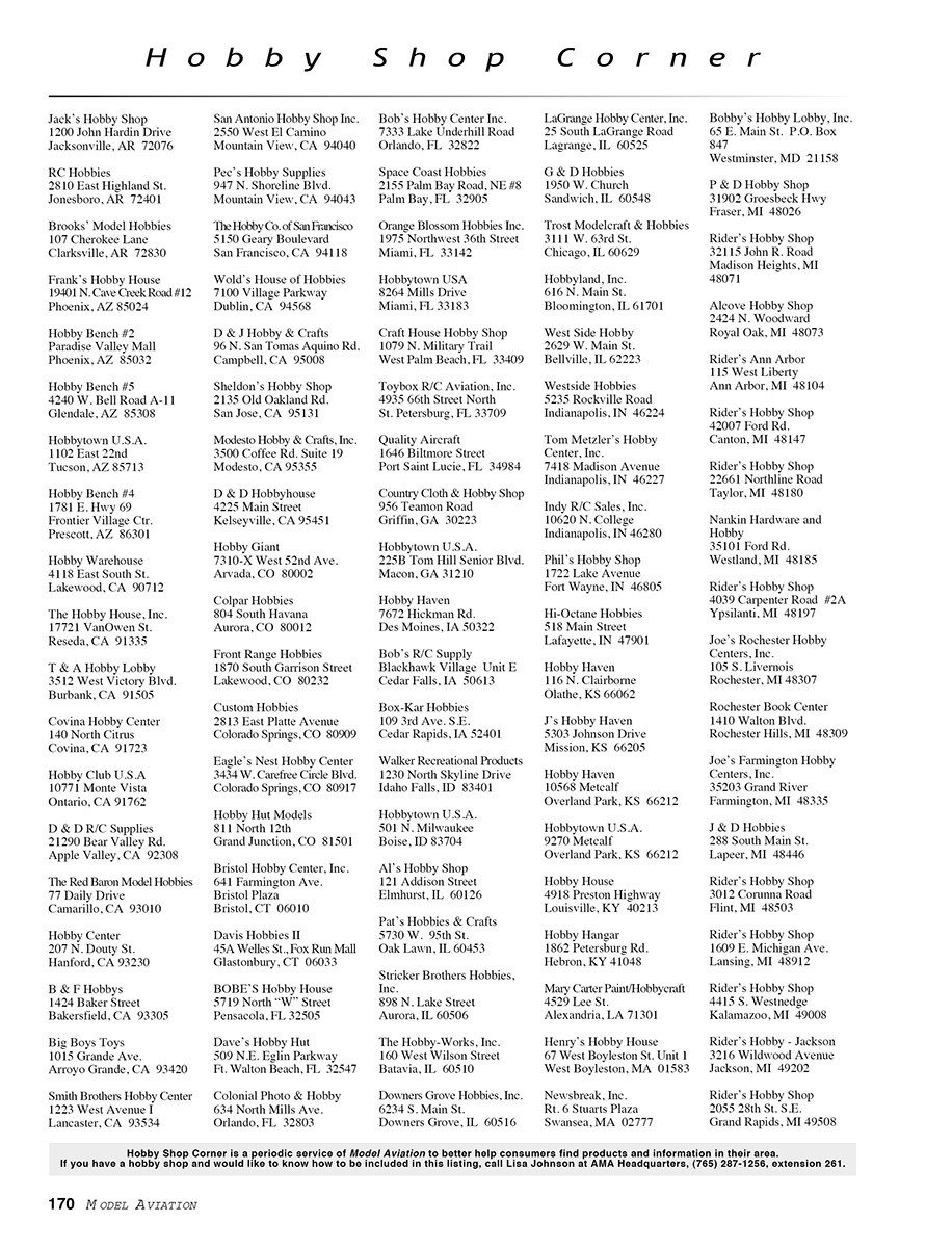 Hobby Shop Corner listings are provided to help consumers find hobby shops. If you have a hobby shop and would like to be included in this listing, call Lisa Johnson at AMA Headquarters: (765) 287-1256, extension 261.