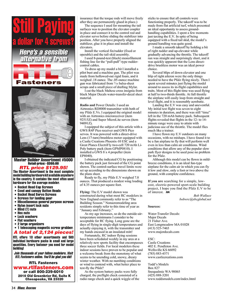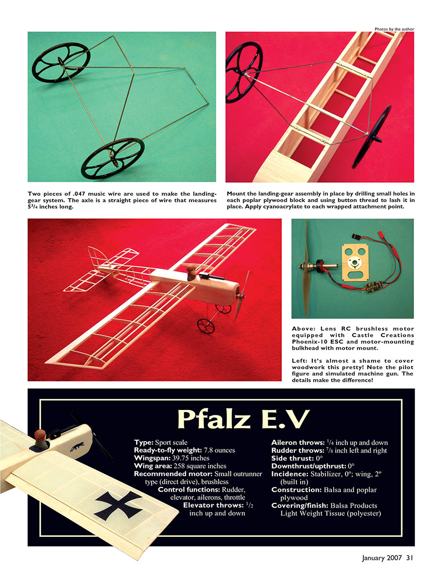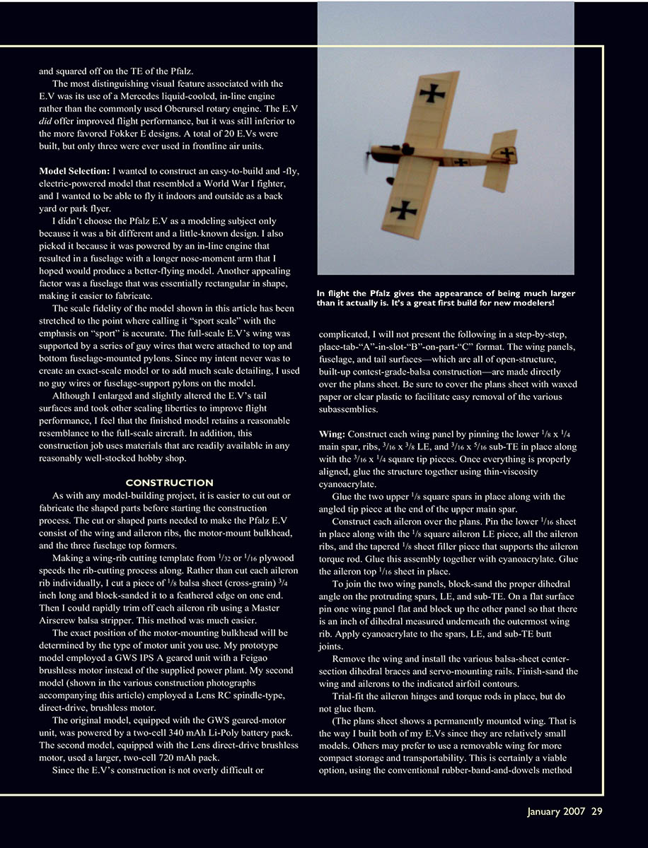 If you are searching for a simple, low-cost, electric-powered sport-scale building project, I hope you find the Pfalz E.V of interest.