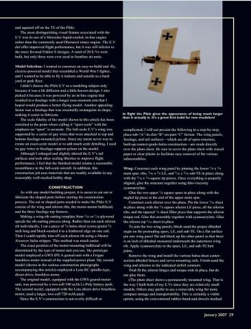 (Note: The plans sheet shows a permanently mounted wing. That is the way I built both of my E.Vs since they are relatively small models. Others may prefer a removable wing for more compact storage and transportability. This is a viable option using the conventional rubber-band-and-dowels method or small nylon bolts. If you pick one of these alternative wing-mounting methods, you will have to modify the wing center-section accordingly.)