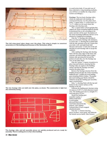 The next step will depend on which method of attaching the wing is to be employed. If the wing is to be permanently installed, as shown on the plans sheet, mark and cut out the sheeting on each side of the fuselage to accept the wing. (The plywood template made to cut out the wing ribs comes in handy for this, but be sure to allow for the LE and sub-TE portions.)