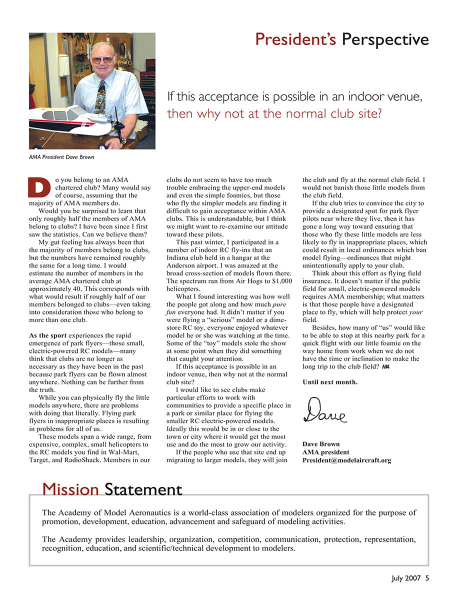 The Academy of Model Aeronautics is a world-class association of modelers organized for the purpose of