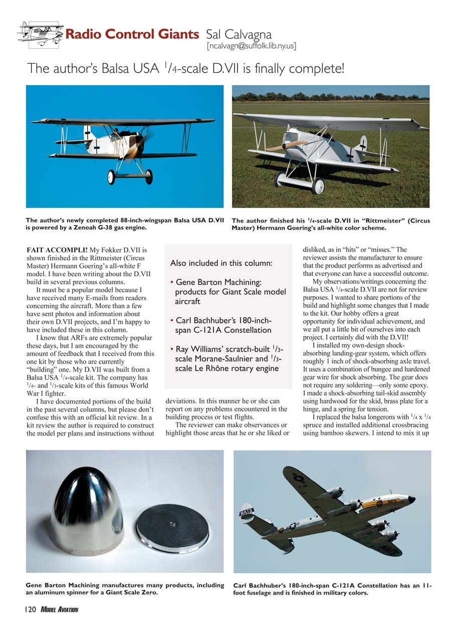 The author’s newly completed 88-inch-wingspan Balsa USA D.VII
