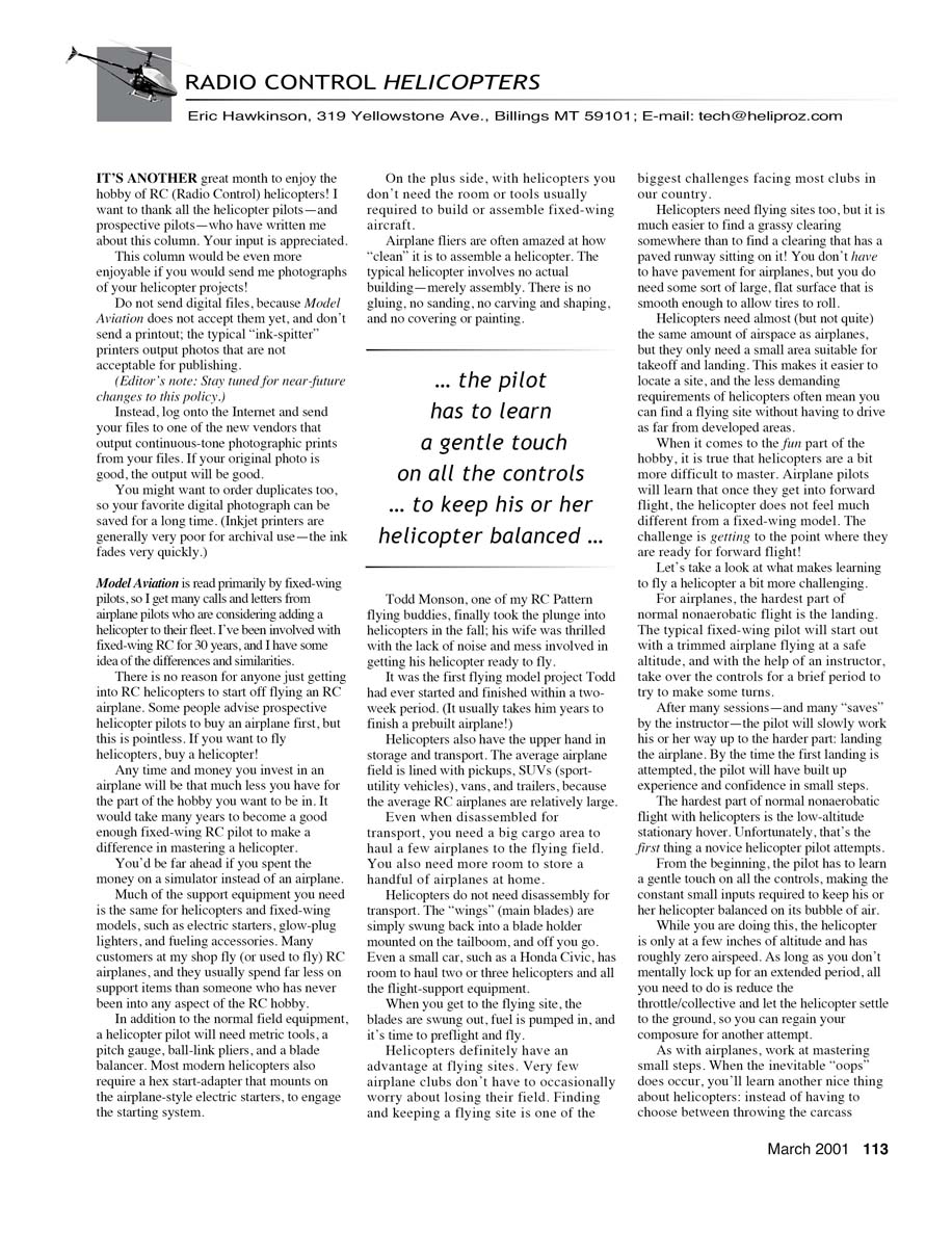 Model Aviation is read primarily by fixed-wing pilots, so I get many calls and letters from airplane pilots who are considering adding a helicopter to their fleet. I've been involved with fixed-wing RC for 30 years, and I have some idea of the differences and similarities.