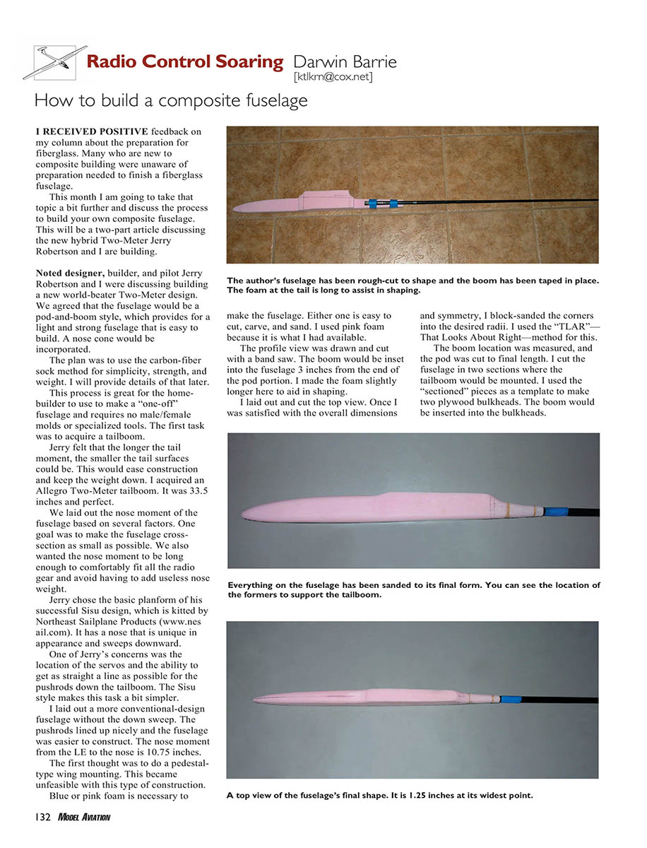 The author’s fuselage has been rough-cut to shape and the boom has been taped in place.